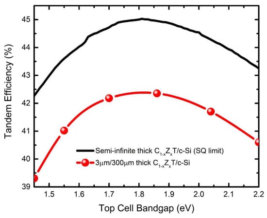 Optically calculated C1−xZxT/c-Si 4T tandem device performance as a function of the top cell bandgap is illustrated in Figure 1. In these calculations, reflection is taken as zero, and no functional layers (i.e., assuming only the two absorbers are stacked up) are employed. The maximum efficiency is obtained with C0.4Z0.6T as the top cell absorber, which has a bandgap of 1.86 eV. In a more practical example, the thicknesses of the C1−xZxT and c-Si layers are reduced to 3 and 300 µm, respectively. The results are in good agreement with the SQ calculations with an offset difference in efficiency. The offset is ascribed to underutilization of incident light as a result of the practical extinction coefficients of absorbers, and the transmission.