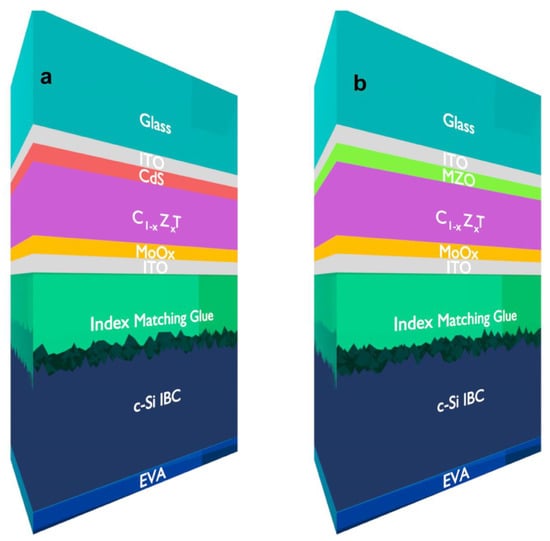 Schematic of C1−xZxT/c-Si interdigitated back contact (IBC) tandem cells with top cell electron transport layers (ETLs) of CdS (a) and Mg0.23Zn0.77O (b).