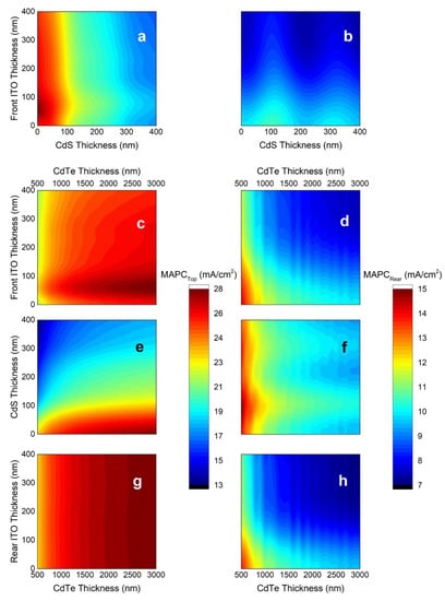 As the practical thickness range of the CdTe layer for an efficient CdTe cell is 0.5 to 3.0 µm [26], most of the incident light is absorbed within a single pass (Figure S1). Thus, the interference of light due to the CdTe absorber is insignificant. The effect of thicknesses of the front layers, CdS and ITO, on the MAPCs of CdTe and IBC Si cells are presented in Figure 3a,b, respectively. To investigate the effects of just the front layers, a sufficiently thick (3 µm) CdTe and no rear ITO are assumed. MAPC of the CdTe cell presents a local maximum at approximately 55 nm thick front ITO layers (Figure 3a), whereas any increased thickness of the front ITO leads to parasitic loss and reduces the MAPC of the IBC Si cell (Figure 3b) [24]. This can be ascribed to the strong free carrier absorption and low refractive index of the ITO layer at the long wavelengths where incident light reaches the IBC Si cell. The CdS layer has adverse effects on the MAPC of the CdTe cell, regarding its nonzero extinction coefficient in the UV and visible parts of the spectrum (Figure S2), whereas it presents local maxima at odd integer multiples of 105 nm in the MAPC of IBC Si cell. These distinct constructive interference thicknesses correspond to the quarter-wave optical thicknesses (QWOT) of the CdS layer at a wavelength of 900 nm. This wavelength is related to the absorption onset of the CdTe absorber, where incident light flux reaches its peak for the rear cell.
