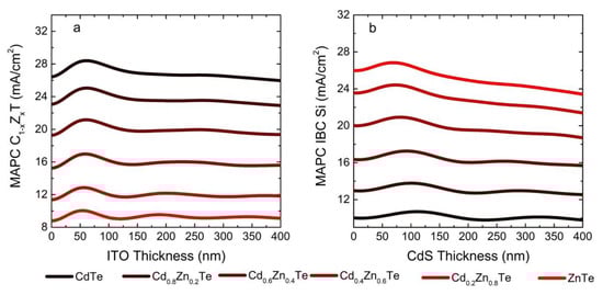 The MAPC of C1−xZxT (a) and IBC Si (b) cells for various x values and C1−xZxT thickness of 3 μm. In panel (a), the front ITO thickness is varied with no CdS and no rear ITO layers employed, whereas in panel (b), the CdS thickness is varied with 55 nm front ITO and no rear ITO layer employed.