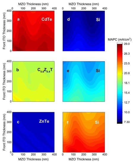 MgxZn1−xO (0 < x < 0.4) is commonly considered as a replacement for CdS to boost the photocurrent of CdTe thin film solar cells [27,28,29] due to its much smaller extinction coefficient (Figure S2). To investigate the effect of an MZO (Mg0.23Zn0.77O) ETL, the MAPCs of CdTe, C0.6Z0.4T, and ZnTe top cells and IBC Si rear cell with respect to ITO and MZO thicknesses are shown in Figure 5. The refractive index of MZO is adjacent to that of ITO in the visible, and as a result, MAPC of the top cell presents local maxima for total thicknesses of front ITO (tITO) and MZO (tMZO) layers (i.e., tITO + tMZO ≈ 60 nm). Another local maximum trend is observed for odd integer multiples of MZO thickness of ~100 nm for CdTe and C0.6Z0.4T absorbers (Figure 5a,b). This thickness corresponds to QWOT at the 700–800 nm wavelength region of the spectrum. As the refractive index of ITO is adjacent to glass in this region of the spectrum, the consolidated thickness behavior is no longer valid, thus the interference of incident light is solely defined by MZO thickness. These anti-reflection trends observed for odd multiples of MZO thicknesses shift to thinner values with increasing Zn content as the absorption edge shifts to shorter wavelengths (Figure 5b). As the absorption edge moves to shorter wavelengths with Zn content, the local maxima when the condition of odd multiples of tITO + tMZO dominates. Therefore, the local maxima of the MAPC for ZnTe present inclined lines, as shown in Figure 5c. Similar to the case of CdS ETL (Figure 4b), the MAPC of the IBC Si cell displays local maxima due to constructive interferences in the MZO layers. MZO presents QWOT behavior for ~120 nm for the MAPC of the IBC Si cell (Figure 5d), which shifts to thinner values with increasing Zn content as shown in Figure 5e,f.