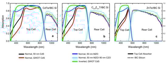 Absorption spectra of CdTe (a), C0.6Z0.4T (b), and ZnTe (c) top cells (solid lines), along with the corresponding IBC Si rear cell absorption spectra (dotted lines); in the normal configuration with 50 nm CdS (black), QWOT CdS (red), 50 nm MZO (blue), 50 nm MZO, and 80 nm CZO as rear TCO (cyan) and in the inverted configuration with QWOT CdS (green). In all cases, C1−xZxT = 3 µm, MoOx = 5 nm, front ITO = 55 nm, and rear TCO (ITO or CZO) = 100 nm. QWOT CdS values are 105 nm for CdTe, 95 nm for C0.6Z0.4T, and 65 nm for ZnTe top cells.