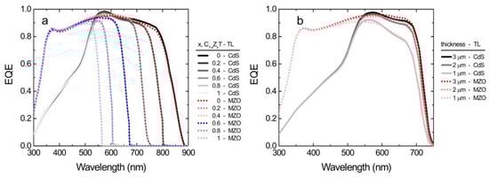 Calculated external quantum efficiency (EQE) spectra for the C1−xZxT top cell as function of (a) the absorber composition (x = 0, 0.2, 0.4, 0.6, 0.8, and 1) at 3 µm thickness and (b) the absorber thickness (1, 2, and 3 μm) at x = 0.6 for with 50 nm ETL of CdS and MZO.