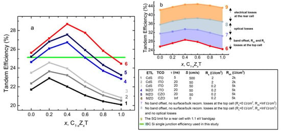 Electrically calculated, more idealized cases (curves 7 and 8) and the SQ limit (with no optical or electrical losses, curve 9) are compared in Figure 8b. Trends in tandem cell efficiency with Zn content stay unchanged with electrical idealization of the top cell (curve 7), whereas an offset performance improvement is demonstrated for both CZO and ITO as rear TCO cases. In the case of the optical idealization (curve 8), the Zn content that gives the maximum tandem cell efficiency shifts to 0.6. When assuming perfect energy alignment of CB and VB levels, perfect front and rear contact energy alignment and no bulk and surface defects and no series and shunt resistance limitations (curve 7), the only loss due to the top cell is the optical ones, i.e., parasitic absorption and reflection losses. The best tandem performance is ~11% short of the SQ limit. Provided the optical losses due to the top cell are also eliminated (curve 8), the deficiency with respect to the SQ limit reduces to ~6%, which should account for losses due to the IBC Si rear cell.