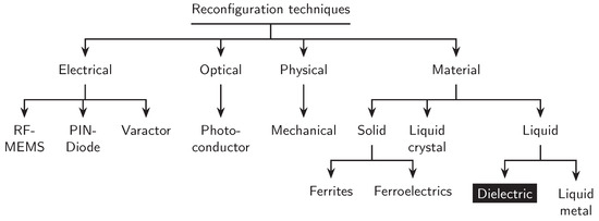 The reconfiguration techniques can be divided into several categories as shown in Figure 1. Four major types of reconfiguration techniques are used, namely the electrical, optical, physical, and material reconfigurations. Electrically reconfigurable antennas use RF microelectromechanical systems (MEMS), PIN diodes, or varactors to redirect the surface currents. Those that rely on a photoconductive switching elements belong to optically reconfigurable antennas. For physical reconfiguration technique, the geometry of the antenna can be altered with the help of mechanical deformation. Finally, with the help of smart materials such as ferrites, ferroelectrics, liquid metal, liquid crystal, and liquid dielectrics, the reconfiguration of an antenna can be achieved [4,6,7,8,9].