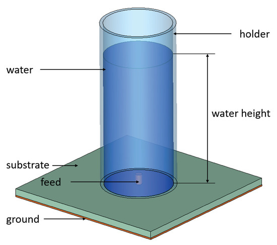 The most common water-based antenna design is a monopole antenna shown in Figure 2. Such antenna typically consists of a cylindrical holder mounted on a dielectric substrate, a feed protruding through the substrate into the holder, and water deposited into the holder. By varying the water height in the holder, the resonance frequency of the antenna can be modified. By modifying the dimensions of the holder, the substrate, and the feed, the radiation parameters of such antennas can be optimized. Many modifications of this basic design have been proposed in the literature and will be discussed here.