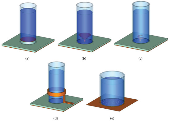 A water-based antenna can be excited by slot antenna, such as for example, an archimedean slot antenna illustrated in Figure 3e. In Reference [53], an archimedean spiral slot was etched into the ground plane to excite a circularly polarized radiation of a square shape water holder ( and modes).