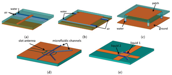 Planar antennas with microfluidic channels. (a) [81], (b) [82,83], (c) [84], (d) [85], (e) [86].