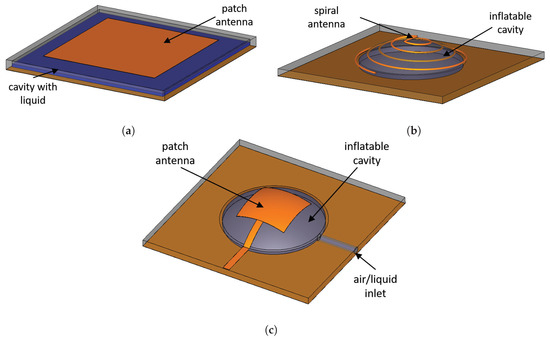 In Reference [84], the performance of a patch antenna was altered with the help of four small cylindrical containers placed like pillars between the ground and the patch, as shown schematically in Figure 5c. Because the electrical field between the patch and the ground plane is stronger than the one above the patch, it is more efficient to put the pillars there, as the authors demonstrated. The containers were strategically placed at the four corners of the patch to be able to control the type of polarization produced by patch. By changing the water level inside the cylinders, frequency and polarization tuning can be achieved.