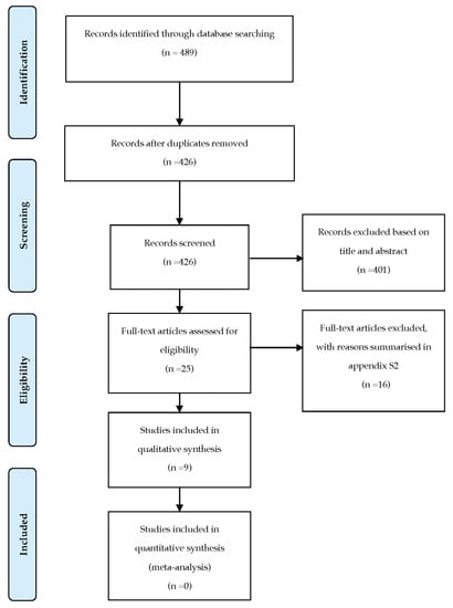 A total of 489 studies were identified from electronic databases. After the removal of duplicates using EndNote reference management software (Clarivate Analytics, Philadelphia, PA, USA), 426 records were screened based on the titles and abstracts. In the case of uncertainty or discrepancies, the article was included. Subsequently, 25 studies were reviewed and evaluated according to the eligible criteria. The final sample included nine studies.