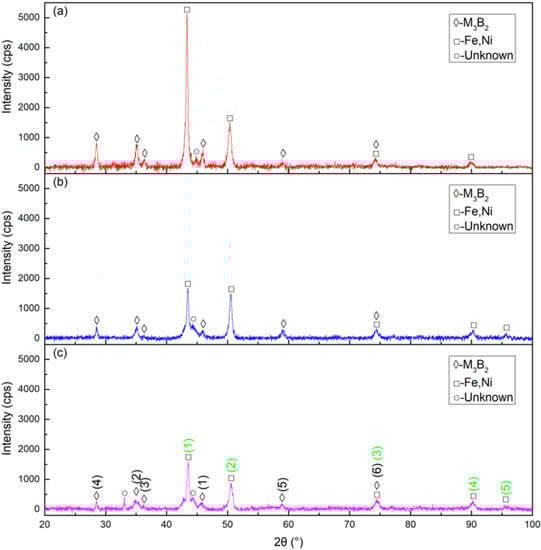 The XRD patterns of cermet coatings were recorded. The laser power was increased to analyze the change in crystal structures. Figure 2. shows the XRD patterns of the coatings. The (M2M)3B2-type boride phase, {Fe, Ni} phase and unknown phase were detected in Sample 1, Sample 2, and Sample 3. The M in the (M2M)3B2 phase represents Mo, Ni, Cr, and Fe. They also represent the sorting of the intensity of the M3B2 and {Fe, Ni} phases, respectively, in a standard card with the black numbers and green numbers. The intensity of M3B2 in Sample 1 was much stronger than in Sample 2, while the intensity of Sample 2 was a little stronger than that of Sample 3. The intensity of {Fe, Ni} in Sample 1 was much stronger than in Sample 2 and 3 at position (1). The intensities of Sample 1 and Sample 2 were approximately the same at position (2) but much stronger than that of Sample 3. Position (1) was the strongest peak and position (2) was the second strongest peak in the standard card. The peak intensities of all samples were similar at the other three positions. The M3B2 phase intensity decreased as the laser power increased. The intensity of the {Fe, Ni} phase also decreased, but not sharply, as the laser power increased.