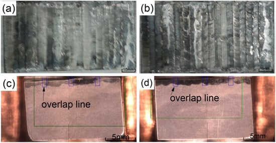 Figure 3a,b show a macro view of the coating after cladding. It can be seen that the overall coating after lapping is relatively flat and there are no visible macro cracks. Figure 3c,d are SEM sample images after aqua regia corrosion is taken from the coating. The light gray is the substrate and the dark gray is the coating. The coating and the substrate are well combined, and the coating can be seen with detailed overlapping patterns.