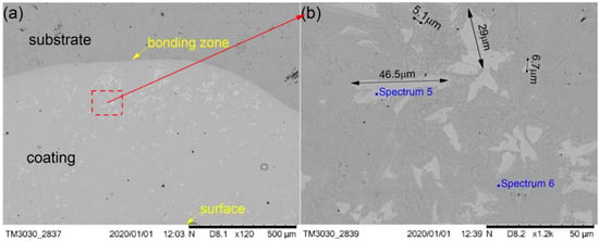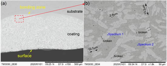 Figure 6 shows the SEM images depicting the cross-sectional morphologies of the cermet coating at the laser power of 2800 W and shows enlarged views of the middle area (Figure 6b). As in Figure 4a and Figure 5a, the curve radian of the interface at the molten pool area is larger than that of the overlap area in Figure 6a. The white phase was present in a lower quantity, and it was unevenly scattered in the coating at 2800 W. There are more white phases distributed at the bottom of molten pool than other areas. The morphology of the white phase is irregular, as shown in Figure 6b. The smaller grain size was approximately 5.1 μm, the larger grain size was approximately 29 μm, and the long grain size could reach up to 50 μm.