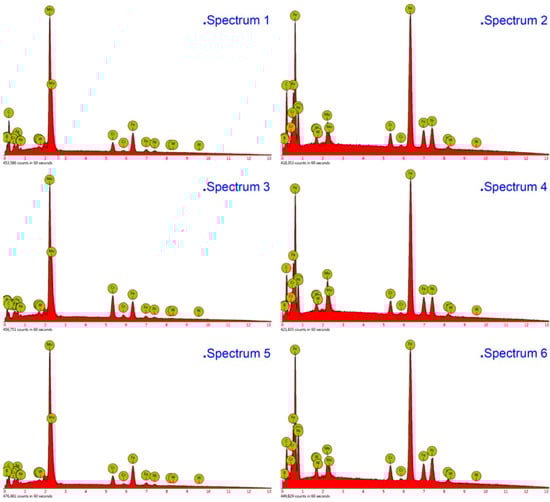 The compositions of the white and gray phases—marked as spectrums 1 to 5 in Figure 4, Figure 5 and Figure 6—were evaluated, as shown in Figure 7, with the increase of laser power. In order to elucidate the effects of laser power on the elements of the white phases, the EDS spectrums 1, 3, and 5 were employed in three kinds of cermet coatings, respectively. Meanwhile, spectrums 2, 4, and 6 were also carried out to depict the variation of gray phases in the cermet coatings. Evidently, the element contents of the white phase and the gray phase are completely different, as shown in Figure 7. The contents of Mo are much higher in the white phases than in the gray phases, whereas the contents of Fe are greatly increased in the gray phase. Thus, the gray phases can be considered as the binder of {Fe, Ni} with few Mo, and the white phases are M3B2 with B aggregation, in which M represents Mo, Ni, Cr, and Fe. The high concentration of Fe originates from the dilution of substrate steels, which is a common phenomenon in laser cladding []. The detailed element contents are given in Table 2.