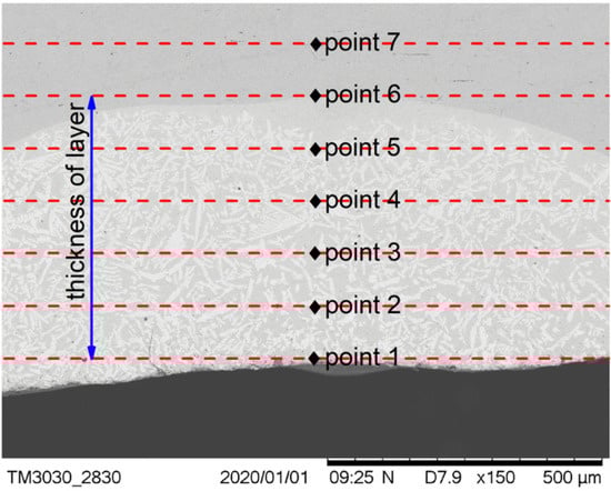 The positions at which the micro Vickers hardness tests of the cermet coatings were carried out are shown in Figure 8. Seven points were tested on the cross-section, and the first point was taken as close as possible to the coating surface. The distance between the test points was one fifth of the thickness of the coating. The distance between the test points was different in the three samples as the coating thicknesses of the samples were different.