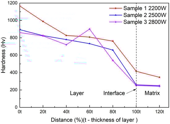 The results of the hardness test are shown in Figure 9. This indicated that the micro-hardness decreased along the surface of the substrate at different laser powers. The hardness of the coating decreased with increasing laser power. The hardness at 2500 W was slightly greater than the hardness at 2800 W, but significantly less than the hardness at 2200 W. The hardness suddenly changed at a certain position in the middle area of the coating when the power was 2800 W; it was not only higher than the hardness of the two positions before and after it, but also higher than the hardness of the other two samples at the same position. The maximum hardness value in all test points was 1166.3 HV, when the power was 2200 W at the surface position.