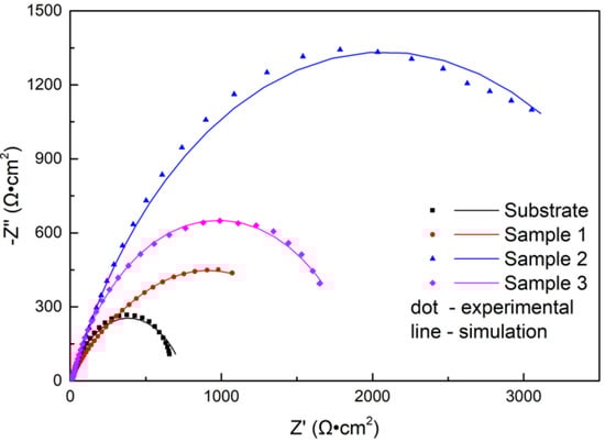 As is known, the EIS technique has been extensively used to characterize surface coatings in a semiquantitative way []. Nyquist plots recorded with samples immersed in NaCl solution are shown in Figure 10. All impedance spectra of the samples displayed depressed semicircles. The diameter of the impedance spectra reflected the rate of the electrochemical reaction []. As shown in Figure 10, the diameter of the impedance spectra arc of coatings increased compared to the substrate. The laser power had a great effect on the impedance spectra of the coating, and the diameter of the impedance spectra arc increased first and then decreased with increasing power. When the power was 2500 W, the corrosion rate was minimum.
