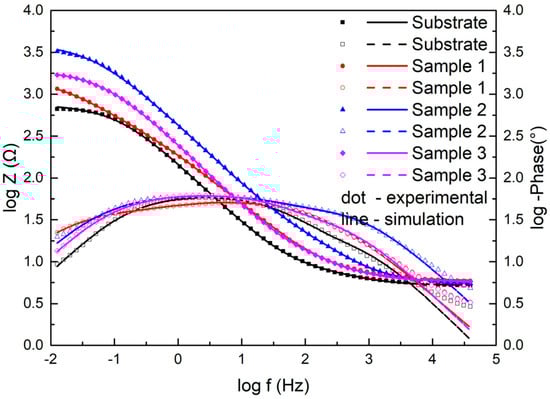 Moreover, Figure 11 displays the electrochemical data of the samples as Bode plots. They exhibited the same features as the Nyquist plots. The Z value was the smallest for the substrate and the largest in Sample 2 among the three coating samples at the lowest frequency, which indicated that the coating had better corrosion resistance than the substrate and had the best corrosion resistance at 2500 W.