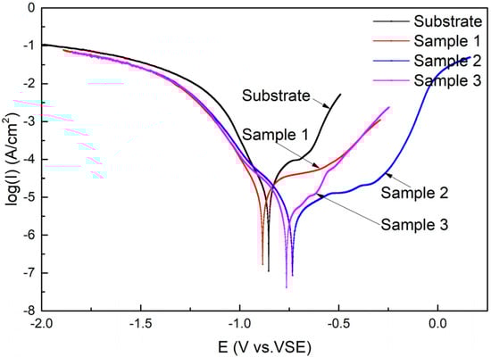 The polarization curves of the substrate and cermet coatings immersed in 3.5 wt.% NaCl solution are presented in Figure 13. It is evident from Figure 13 that both the substrate and the coatings have undergone the transition process from the activated state to the passivated state and ultimately, to overpassivation; however, the duration of each process varied. The self-corrosion potentials of Samples 2 and 3 shifted positively compared to the substrate, but the self-corrosion potentials of Sample 1 shifted negatively, while the OCPs of coatings were all positively shifted. The passivation state of the substrate and Sample 3 was short, quickly changing to the overpassivation state, but Sample 3 experienced a brief secondary passivation state. Samples 1 and 2 maintained a long passivation state, and Sample 2 entered a secondary passivation state after overpassivation. The polarization curves show that the coating at 2500 W had very good corrosion resistance.