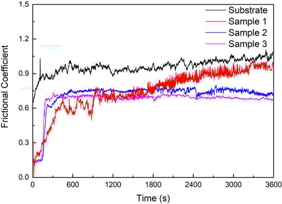 The frictional coefficient curves of the substrate and cermet coatings are shown in Figure 14. The frictional coefficients of the substrate and coatings rose rapidly at the start of the test, and then the substrate and Samples 2 and 3 entered the steady wear stage after a breaking-in process of approximately 2.5 min, whereas Sample 1 took approximately 7.5 min. After entering the steady state, the frictional coefficient of the substrate and Sample 1 displayed some fluctuations and showed a slight upward trend, while the fluctuations in the frictional coefficient of Samples 2 and 3 were small and showed a downward trend. The order of the frictional coefficients of the substrate and the coating tended to be consistent after sliding for 30 min. The frictional coefficient of the substrate was larger than that of the coatings, and this decreased as the power increased. The frictional coefficient of coatings was the smallest at 2800 W.