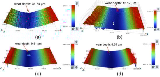 The three-dimensional morphologies of the wear tracks of the substrate and coatings are shown in Figure 16. The plow-furrows can be clearly identified in the worn area of the substrate, and some pits were found on the surface of Sample 1, while only fine scratches were found on the surfaces of Samples 2 and 3. As seen from Figure 16, the wear tracks of coatings had a lower wear depth than that of the substrate (31.74 μm). The wear depth of Sample 2 (9.41 μm) was similar to that of Sample 3 (9.69 μm), which was much smaller than that of Sample 1 (13.17 μm). This further confirmed that the coating had the best wear resistance at 2500 W.