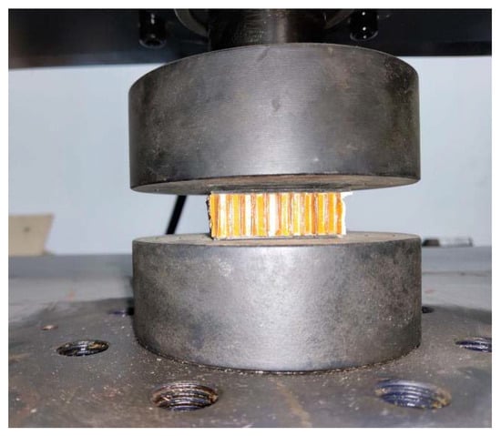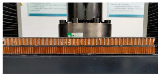 The loading program refers to the test method for flatwise compression properties of sandwich constructions or cores [33,34]. The specimen was placed in the middle between the upper and lower steel pads to make sure the load is perpendicular to the panel, and then adjusted the zero point of the universal testing machine. When testing the modulus of elasticity of flatwise compression, apply the load to about 50% of the failure load according to test method; record the load at all stages and the corresponding deformation value; then apply the load to failure level by level; and record the failure load, failure mode, and flatwise compression strength. The initial loading rate of the indenter in the test is 0.5 mm/min. The loading device is shown in Figure 5.