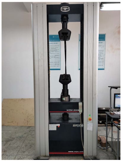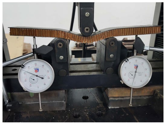 The flatwise compression test and the bending test both use the electronic universal testing machine produced by Jinan Shidai Shijin Corporation, Jinan, China, as shown in Figure 4. The type is WDW-300E, with a maximum loading force of 30 kN. The mechanical dial gauge produced by Gulin Guanglu Corporation (Gulin, China) is used in the bending test; the accuracy value is 0.01 mm.