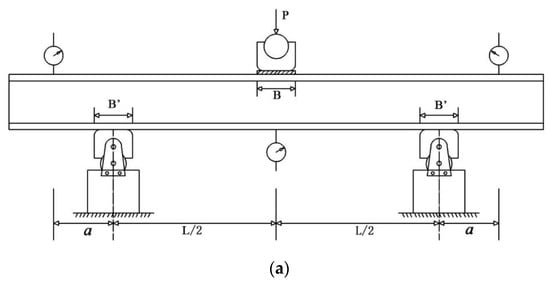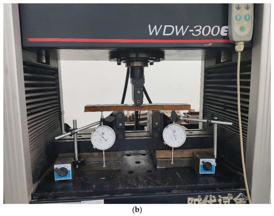 Place the bending specimen in the middle of the upper indenter and the lower two supports, the upper indenter and the support are free rotating cylinders; then, place the mechanical dial gauge (Guilin, China) at the marked points of the overhanging beams on both sides to measure the displacement. After the specimen is fixed, adjust the zero point of the universal testing machine, and the load is applied vertically to the middle of the panel. The initial loading rate of the test indenter is 2 mm/min; the loading device is shown in Figure 6a,b and the parameters of the loading device are shown in Table 5.