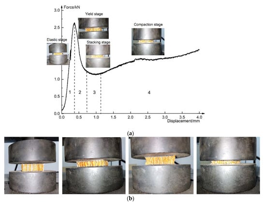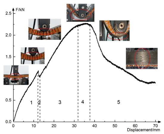 In the process of flatwise compression, it is assumed that the upper and lower sheets are not deformed. According to the load–displacement curve of flatwise compression in Figure 8a, combined with the core deformation process, it is found that the basalt fiber reinforced honeycomb sandwich structure goes through four stages: