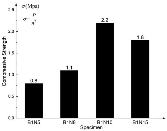 The flatwise compression strength refers to the maximum failure load that the structure can bear under the unit area, which is calculated according to Equation (1). The flatwise compression modulus of elasticity Ec of sandwich structure is calculated according to Equation (2) [34]. Choose the 30% failure load and 60% failure load as the starting point and endpoint in the load–displacement curve to calculate Ec. is the displacement increment relative to the load increment. The flatwise compression strength and elastic modulus are shown in Figure 9 and Figure 10, respectively.