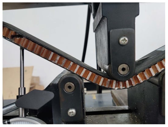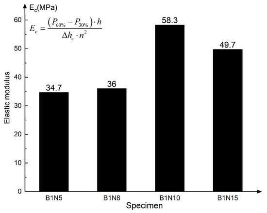 - In Equation (3), P is the mid-span load, W is the width of the specimen, h is the height of the honeycomb, and the calculation results of each specimen are shown in Figure 15.