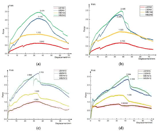 Load–displacement curves of bending specimens: (a) Load–displacement curves of N5; (b) Load–displacement curves of N8; (c) Load–displacement curves of N10; (d) Load–displacement curves of N15.