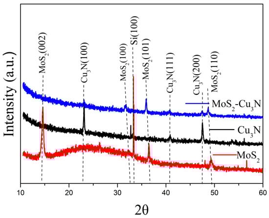 The XRD test patterns of MoS2 layer, Cu3N layer, and Cu3N/MoS2 heterojunction are shown in Figure 1. The 2θ in the MoS2 (002), (100), (101), and (110) crystal planes was found at 14.55°, 32.3°, 36.5°, and 49.4°, respectively [22,35]. The absence of other impurity peaks in the spectrum indicated the high purity of the obtained MoS2. Moreover, the sharp diffraction peak of MoS2 revealed the good crystallinity of MoS2. The average grain size of the heterojunction was 14.9 nm, which was smaller than the grain size observed in the SEM image. This may have been because the size of the grain aggregate observed by the SEM was not the size of the single grain; therefore, the particle size value observed by SEM was often larger than the calculated value. When the Cu3N layer was deposited on the MoS2 layer to form the Cu3N/MoS2 heterojunction, the sample still showed reflection on the (100), (101), and (110) crystal planes of MoS2. However, the intensity of the (100), (101), and (110) crystal planes of MoS2 in the Cu3N/MoS2heterojunction was weaker than that in the pure MoS2 layer, indicating the reduced crystal quality of the MoS2 layer after Cu3N deposition. Compared with that of the pure Cu3N layer, the strength of the (100) and (200) crystal planes of Cu3N in the Cu3N/MoS2 heterojunction decreased, possibly due to the interdiffusion of atoms that occurred at the interface between MoS2 and Cu3N and led to the reduced quality of heterogeneous crystals.