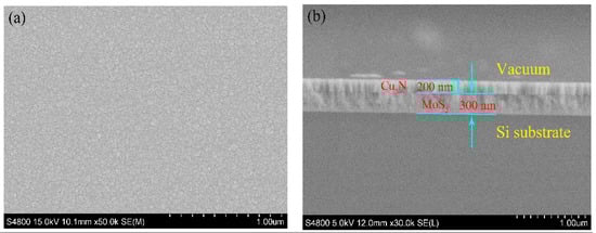 The surface and cross-sectional morphology of the Cu3N/MoS2 heterojunction are shown in Figure 2. This surface of the MoS2 layer was generally smooth and flat with block particles of uniform size and no evident cracks. These characteristics were beneficial to the growth of the Cu3N layer on the surface of the MoS2 layer. Figure 2b shows the thickness of the heterojunction. The MoS2 and Cu3N layers had a thicknesses of approximately 300 and 200 nm, respectively. The boundary between the layers clearly showed the heterojunction structure. The relationship between the film deposition thickness and deposition time suggested that the Cu3N/MoS2 heterojunction was approximately 50 nm-thick.