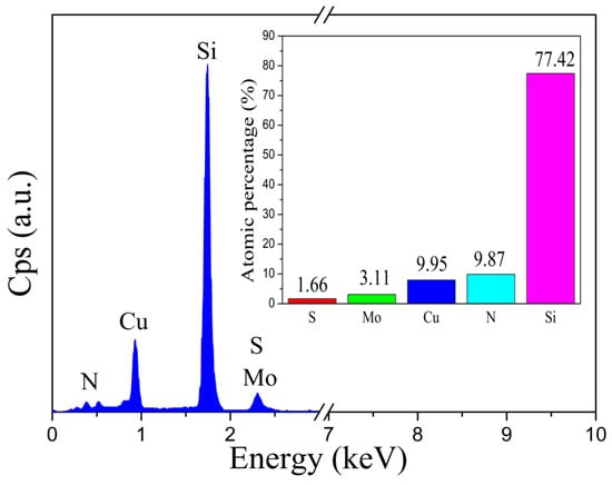 The distribution of elements in the Cu3N/MoS2 heterojunction and the atomic percentage of each element are shown in Figure 3. EDS data revealed that the ratio of Cu to N atoms in the heterojunction was around 1. Moreover, its chemical ratio differed from the standard ratio of Cu3N, possibly because of the free Cu atoms in the heterojunction. These free atoms did not combine with the N atoms to form Cu3N. However, fewer Mo and S atoms were detected on the surface of the heterojunction. The ratio of Mo and S atoms was about 1.87. This phenomenon occurred because MoS2 can be found in the lower layer, and some Mo atoms in the lower layer had moved to the surface. Meanwhile, the S atoms had difficulty in reaching the surface. The atomic ratio of Cu and N in the film Cu3N was 1:1, which does not meet the standard atomic ratio of Cu3N, in which the N element was significantly more than the Cu element. This is because during the deposition process, the ratio of N2 to Ar was high, and a part of the free N atoms were adsorbed between the crystal grains. However, when Mo: S = 3.11:1.66 = 1:0.53 ≈ 1.87:1, there were fewer S atoms. This may have beeen because when MoS2 is deposited, a part of S becomes a single substance to escape, resulting in fewer S atoms. Mo atoms that were not combined into MoS2 combined with MoO3 to oxygen (as shown in Figure 4e,f). In addition, the XPS spectrum also proved that there were a large number of Cu+, N− (as shown in Figure 4c,d), and Mo-S bonds (as shown in Figure 4e,f) in the film. It showed that the heterojunction is mainly composed of Cu3N and MoS2, and contains only a small amount of MoO3 and N atoms, which does not affect the formation of Cu3N/MoS2 heterojunction. In addition, the Si atoms detected via EDS originated from the monocrystalline silicon substrate.