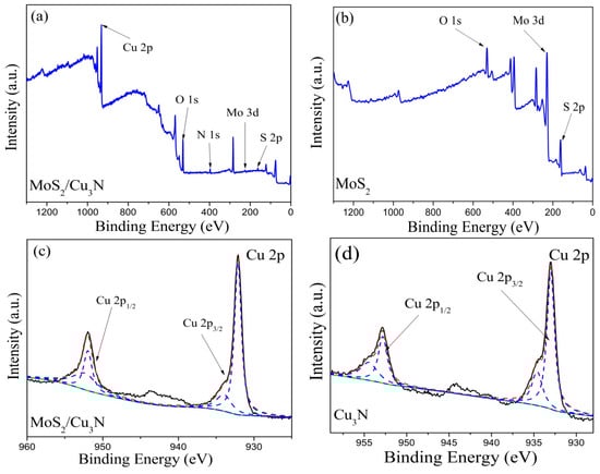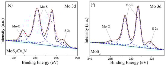 The chemical composition of the Cu3N/MoS2 heterojunction was characterized using XPS, and the test results are shown in Figure 4. Figure 4a,b illustrates the total spectrum of the Cu3N/MoS2 heterojunction and MoS2 thin film, respectively. Figure 4a depicts that the binding energies of the S2p, Mo 3d, N1s, O1s, and Cu2p peaks were 162.6, 227.8, 397.4, 530.5, and 931.3 eV, respectively [15]. Figure 4b shows that the S2p and Mo 3d peaks appeared at the binding energies of 161.5 and 229.5 eV, respectively. The O1s peak appearing in the spectrogram might be due to the inevitable atmospheric pollution in the heterojunction during transfer and testing. However, a weak S2p peak appeared at 162.6 eV possibly due to the trace S atoms sputtered out during the deposition of the remaining MoS2 layer in the vacuum chamber, thus causing pollution in the Cu3N layer. The high intensity peaks with binding energies of 931.1 and 952.1 eV corresponded to the Cu2p3/2 and Cu2p1/2 orbital peaks, respectively, as shown in Figure 4c. Figure 4d illustrates the fitting of Cu2p peaks in the Cu3N layer with the Cu2p3/2 and Cu2p1/2 orbital peaks at the binding energies of 932.81 and 952.76 eV, respectively [27]. In Figure 4c,d, weaker peaks appeared at the binding energies of 933.9, 952.6 eV and 934.5, 954.4 eV, which belong to Cu2+, which is caused by the slight oxidation of Cu+. Figure 4e,f depicts the Mo3d spectra in the Cu3N/MoS2 heterojunction and pure MoS2 layers, respectively. After the XPS spectrum of Mo3d was fitted, four peaks appeared with different intensities. The two main peaks located at 232.0 and 228.5 eV could be inferred as the Mo3d3/2 orbital peak in the Mo–S hybrid bond structure in MoS2 that characterized Mo4+ in MoS2. The two weak peaks at 223.46 and 232.95 eV could be attributed to the S2s orbital and Mo–O hybrid bond structure that indicated the formation of sulfide and partial oxidation on the film surface [23]. However, the Mo–S hybrid bond of the Mo3d orbital peak of pure MoS2 was located at the binding energies of 228.4 and 231.5 eV. The XPS spectra were consistent with the XRD and EDS results and indicated a large number of MoS2 and Cu3N in the heterojunction.