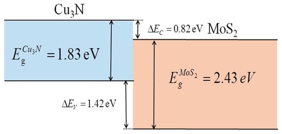 According to Equations (1) and (2), the VBO and CBO between the MoS2 and Cu3N samples were 1.42 and 0.82 eV, respectively. The band gap values of MoS2 and Cu3N at 2.43 and 1.83 eV, respectively, were consistent with those measured in the US–vis transmission spectrum, and the maximum valence band values (VBM) of MoS2 and Cu3N were 1.15 and 1.40 eV, respectively [13]. The energy band diagram of the Cu3N/MoS2 heterojunction interface could be deduced on the basis of the calculated value as shown in Figure 5. The arrangement of II-type staggered band of the Cu3N/MoS2 heterojunction was conducive to the charge separation of electrons in the heterojunction because the Fermi level of Cu3N was higher than that of MoS2. After the two materials adhered to form the heterojunction, the interface electrons flowing into Cu3N from MoS2 increased the number of electrons in the Cu3N layer and caused additional holes in the MoS2 layer. These conditions changed the optical band gap. The formed heterojunction can be applied to various high-performance photoelectric devices, such as photocatalysts and photodetectors.