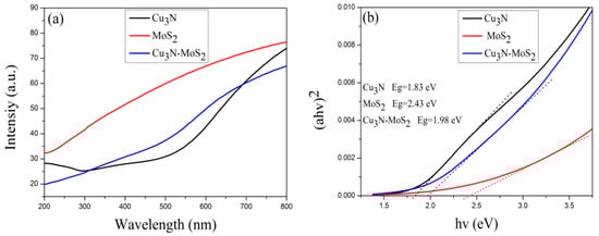 The UV-vis transmission spectrum and diagram of band gap calculation of the Cu3N/MoS2 heterojunction are shown in Figure 6. The transmittance of the pure Cu3N layer in the wavelength range of 350–650 nm was clearly improved after a heterojunction was formed between Cu3N and MoS2. According to the transmission spectrum curve of the thin film, the Eg of Mo-Cu based compound region can be calculated using the optical constant law (3) and Tauc Equation (4) as follows [31]: