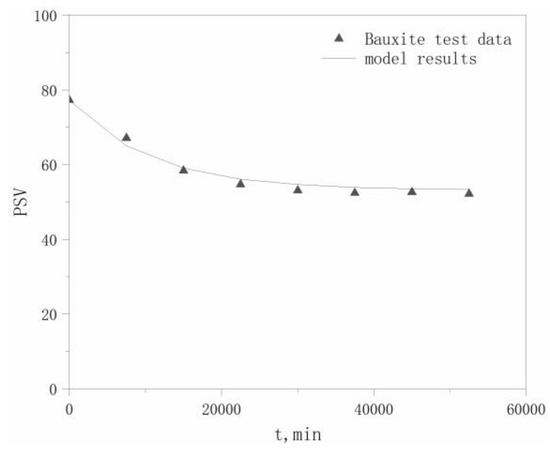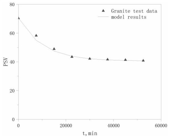 The PSVs of the four aggregate samples at t = 0 and 15,000 min were selected to determine the Px values, with the analyzed experimental values [22] listed in Table 4. The Px values for the four aggregates were then determined by rearranging Equation (9):