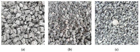The coarse aggregate sample: (a) diabase, (b) granite, and (c) limestone.