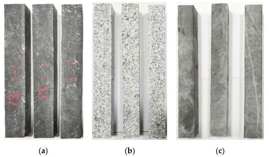 Three types of EAC beam specimens: (a) diabase, (b) granite, and (c) limestone.
