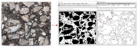 The cross section of the asphalt mixture beam after flexural fracture contained voids, asphalt mastic, and aggregate. The aggregate fracture was related to the EAC fatigue cracking performance using digital image processing (DIP) to statistically quantify the aggregate fracture area on the specimen cross section. ImageJ is a Java-based image processing software developed by the National Institutes of Health (Version: 1.52q, NIH, Bethesda, MD, USA). The scale and units are set, and the image is processed using binarization, enhancement, and contour feature extraction. Then, the number of aggregates on the cross section is automatically extracted, and the fracture area of aggregates is statistically quantified, as shown in Figure 6. A high-definition digital camera was used for image acquisition, and the contour of the binarized image was enhanced using Photoshop software (Photoshop CC 2017, Adobe Systems, Inc., San Jose, CA, USA). In the experiment, six specimens were tested for each EAC.