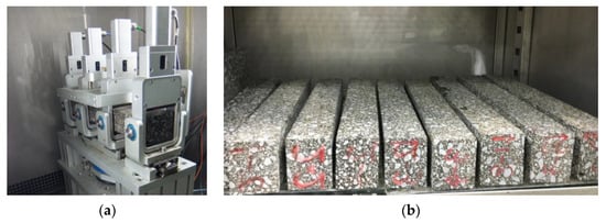 Fatigue tests were conducted to understand the influence of cyclic loading on the flexural cracking behavior of epoxy asphalt mixtures on a steel bridge deck pavement. EAC samples were subjected to a four-point bending fatigue test assessed according to the American Association of State Highway Transportation Officials (AASHTO) T 321-03 at a temperature of 15 °C and a loading frequency of 10 Hz in the strain control mode using a NU-14 fatigue testing machine (Cooper Research Technology Ltd., Ripley, Derbyshire, UK). The failure point is defined as the point in the load cycle at which the specimen exhibits a 50% reduction in stiffness relative to the initial stiffness. The beam specimens used for the fatigue test were characterized by dimensions of 380 mm (length) × 63.5 mm (width) × 50 mm (height) and were obtained by cutting 400 × 300 × 70 mm slabs prepared using a laboratory roller compactor. The test device and beam specimens are shown in Figure 7. In the experiment, four specimens were tested for each EAC.
