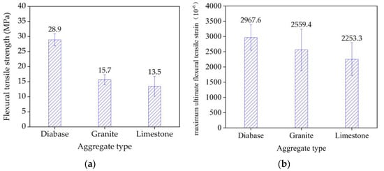 Three-point bending test results of three EAC beam types: (a) flexural tensile strength and (b) ultimate flexural tensile strain.