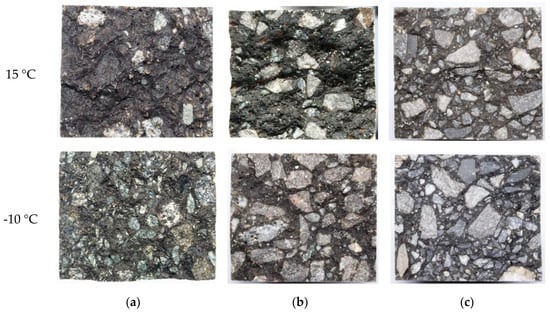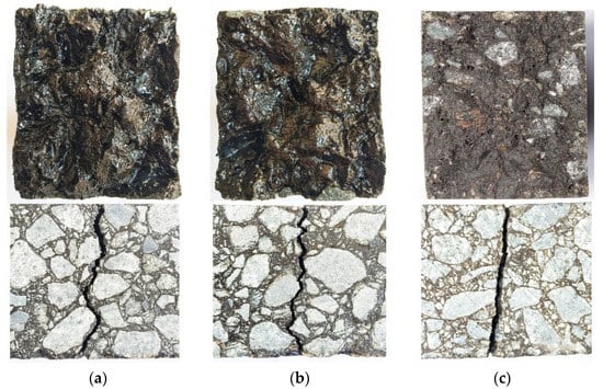 Beam fracture sections of different types of asphalt mixtures: (a) A-70, (b) SBS-modified asphalt, and (c) epoxy asphalt.