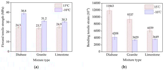 The three-point bending test results for EACs are shown in Table 10. The mid-span deflection and critical load of the three mixtures were not significantly different at 15 °C. Under the condition of −10 °C, the °C, diabase EAC exhibited the highest mid-span deflection and critical load, with values of 0.76 mm and 4618.4 N4N, respectively. The EAC load–displacement (P–V) curves at two temperatures are shown in Figure 10. The three types of EACs exhibited two fracture modes (i.e., elastoplastic fracturing at 15 °C and brittle fracturing at −10 °C). The EAC beam bending test results for the three aggregate types at these two temperatures are shown in Figure 11. The three aggregate mixtures exhibited significantly different tensile strengths at −10 °C and significantly different flexural tensile strains at 15 °C. The diabase EAC exhibited the highest flexural tensile strength and ultimate flexural tensile strain at the two temperatures; that is, the EAC with the high-strength aggregate had the highest flexural tensile resistance.