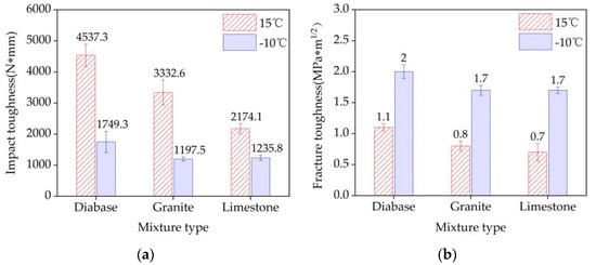 Three-point bending test results of the three mixture beam types: (a) impact toughness and (b) fracture toughness.