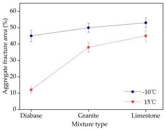 The statistical results of the aggregate fracture area ratio are shown in Figure 13. The cross sections of the EAC beam specimens of the different aggregate types are shown in Figure 14. At the same temperature, the aggregate fracture area of diabase EAC was smaller than those of the granite and limestone EACs. For example, at 15 °C, the aggregate fracture area ratios of the cross sections of the EAC specimens containing diabase, granite, and limestone were 12%, 38%, and 45%, respectively. At the test temperature of −10 °C, the proportion of fractured aggregates in the EACs increased, and the aggregate fracture area ratios of the cross sections of the EAC specimens containing diabase, granite, and limestone increased by 275%, 32%, and 18%, respectively. The analyses discussed in Section 4.3 showed that under the same conditions, the EAC flexural tensile resistance increased with the aggregate strength. Combining this result with the fracture analysis of aggregates of different strengths shows that the lower the ratio of fractured aggregates in an EAC, the higher the flexural tensile strength of the mixture. Thus, using high-strength aggregates to reduce the ratio of fractured aggregates significantly enhances the EAC flexural resistance.