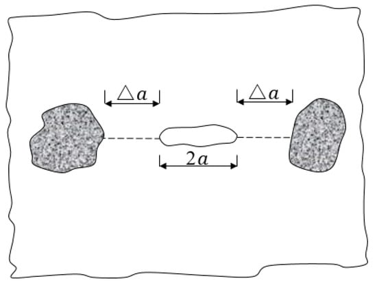Energy is converted in the material failure process. Most of the strain energy accumulated in the material under loading is released in the form of fracture surface energy. EAC exhibits approximately linear elastic material characteristics under loading within a certain range of temperatures, and the Griffith formula can be used to describe crack propagation in the mixture [28]. A crack encounters aggregates while propagating in asphalt mastic, as shown in Figure 15. Assuming an initial crack length in asphalt mastic of 2, a crack propagates rapidly after the stress reaches, which is defined using the Griffith formula as follows: