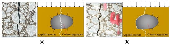 In general, the fracture surface energy of the aggregate is greater than that of the asphalt mastic (i.e., > . In fracture mechanics theory, a crack always propagates along the path of least energy dissipation [29]. Under normal circumstances, less energy is required for a crack to pass around than through an aggregate. The crack has already passed around an aggregate before the load is applied for the stress to reach .